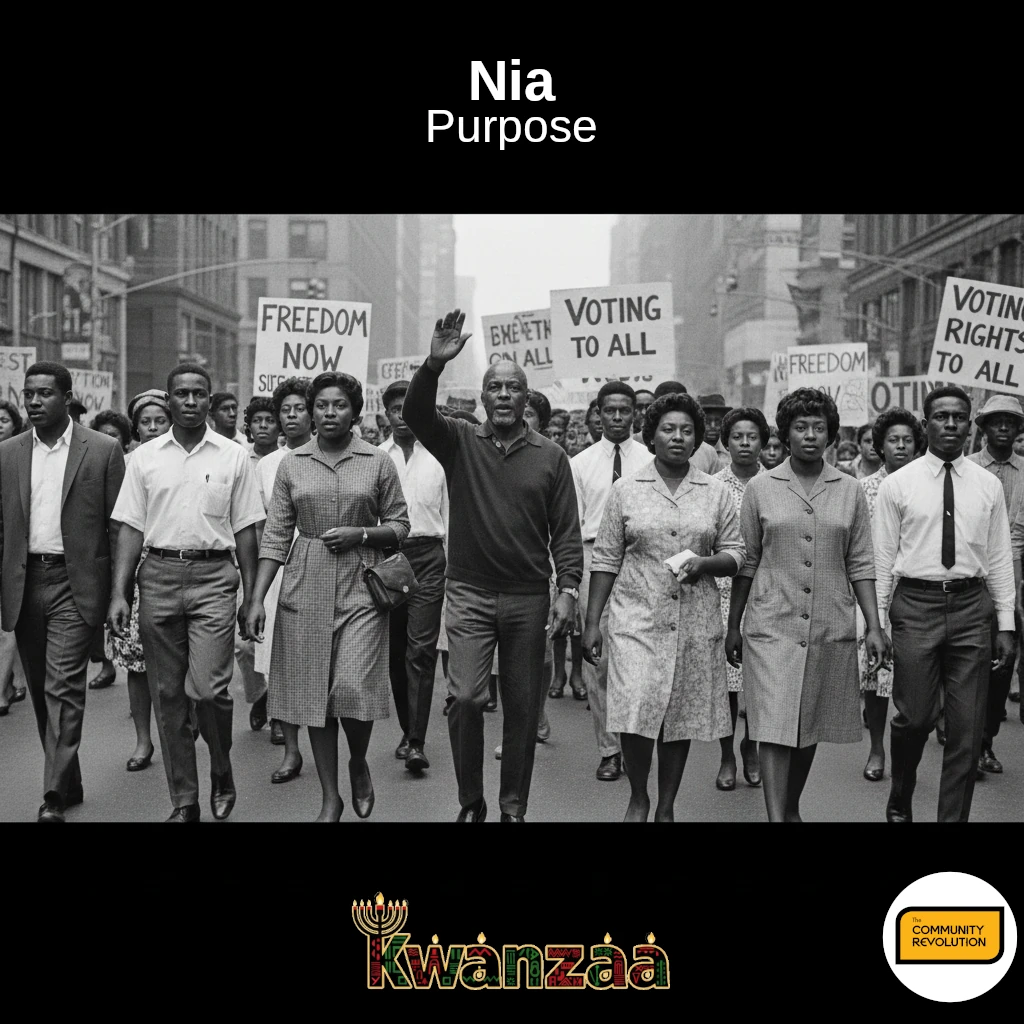 Nia is powerfully demonstrated by collective movements galvanised by a singular purpose of achieving justice and equality. The American Civil Rights Movement of the 1950s and 1960s, led by figures such as Dr. Martin Luther King Jr., Rosa Parks, and John Lewis was a movement that transcended individual ambition, uniting millions under a clear moral objective. The clarity of this purpose led to transformative social and political change.